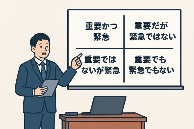 ホワイトボードやタスク管理ツールを使い、すべての業務を4象限に分類することで、今何に集中すべきかが明確になります。この習慣が、時間を守り、長期的な成果を生み出します。